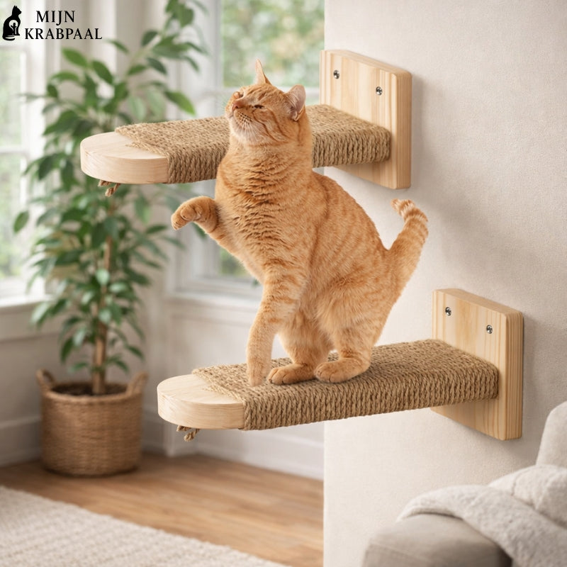 Ontdek onze muurkrabpaal trap, het perfecte accessoire om krabben en klimmen te combineren terwijl het een vleugje elegantie aan je interieur toevoegt. Gemaakt van massief hout en bedekt met natuurlijk sisaltouw, deze trap is ontworpen voor het geluk en welzijn van je kat.